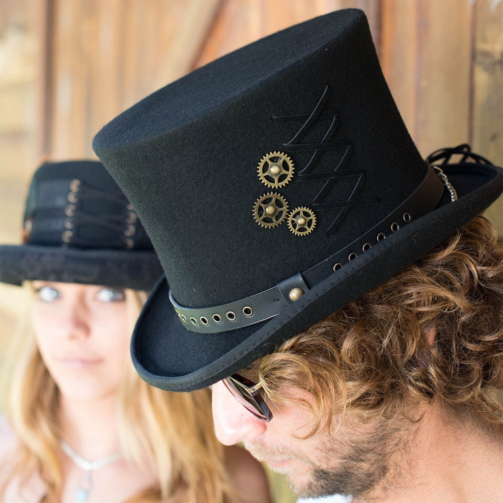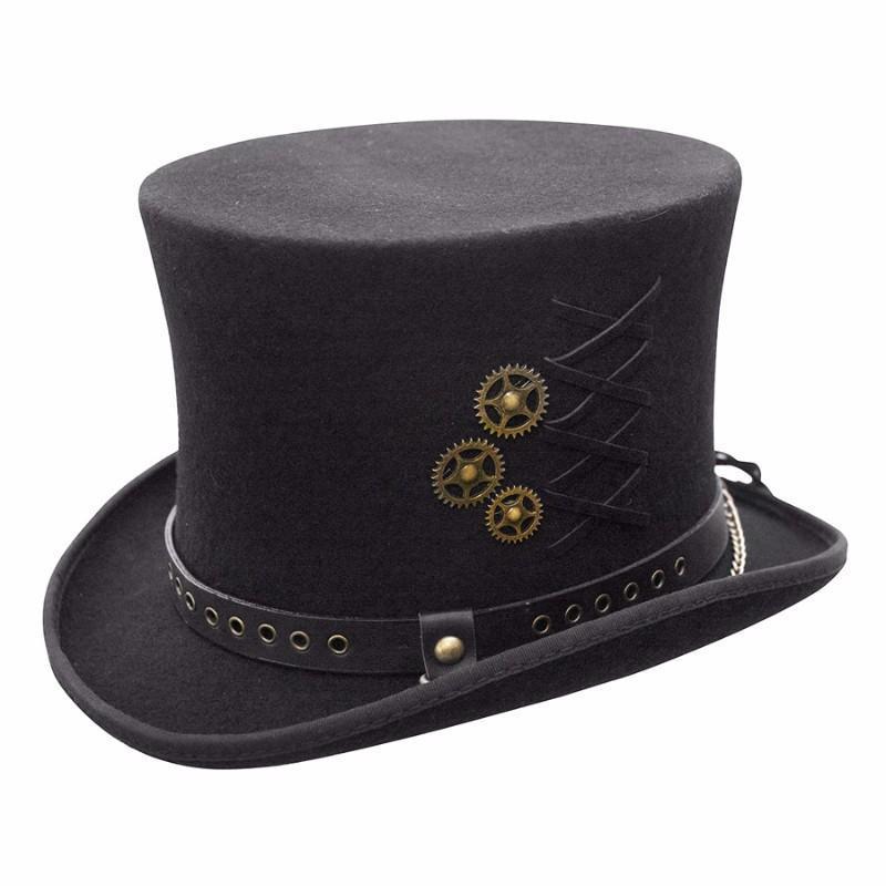 This sophisticated Steampunk Wool Top Hat is expertly crafted from luxurious Australian wool and features stylish gears for an iconic steampunk look. It's lined with soft satin for a comfortable feel and offers unique, eye-catching style.