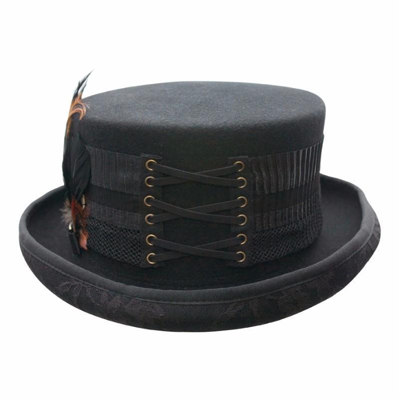 The London lace Victorian ladies hat is made from premium Australian wool and features fine lace under the brim. An exquisite feather arrangement and unique corset trim makes this beauty stand out. Features a satin lining. If your into SteamPunk styles or the lacy Victorian era, this hat is perfect.