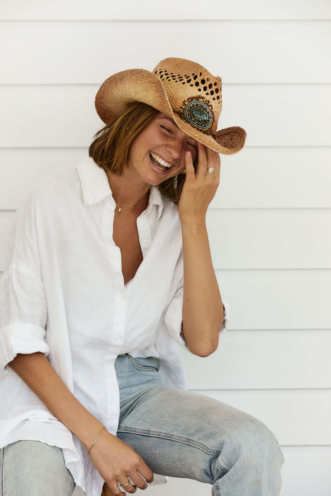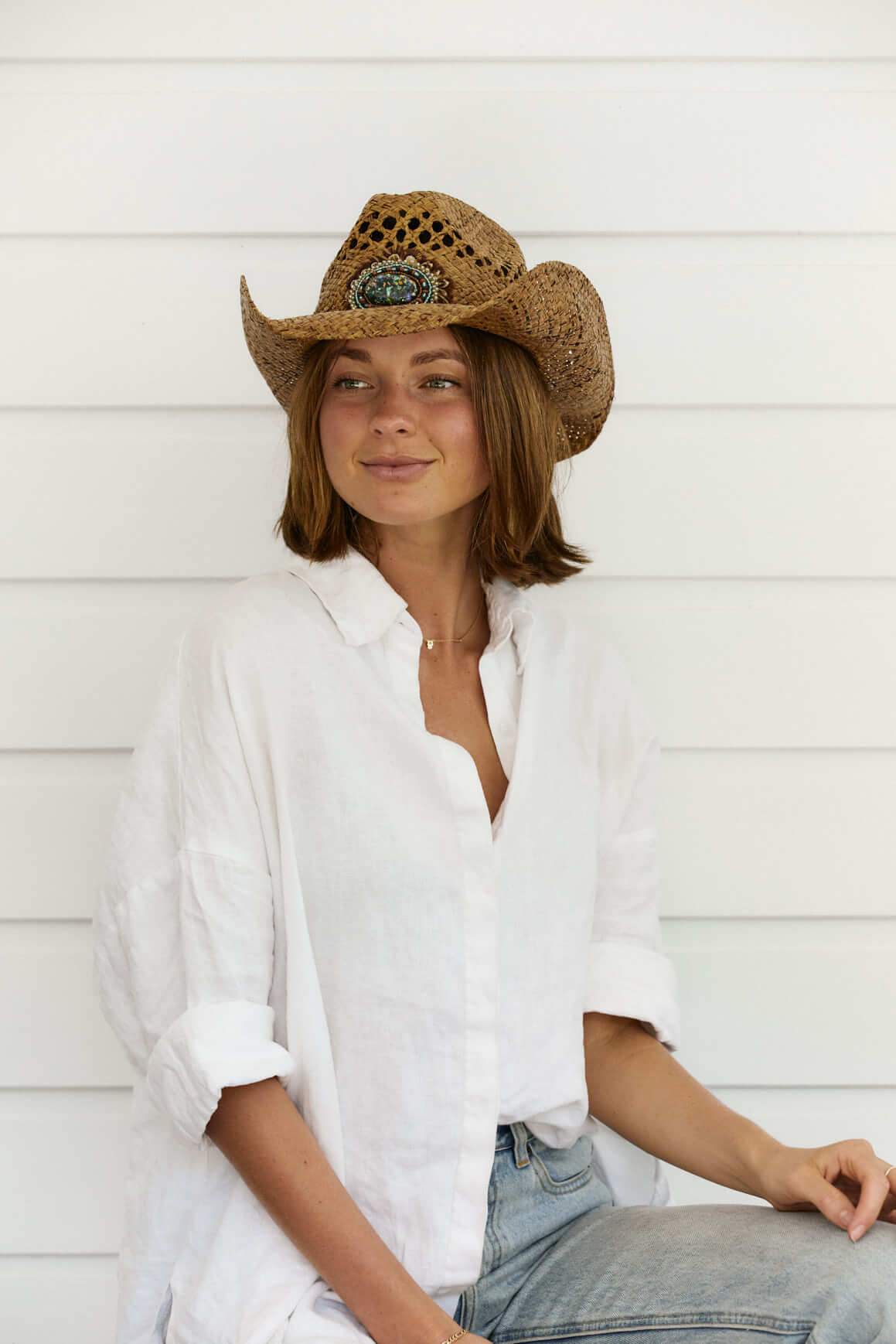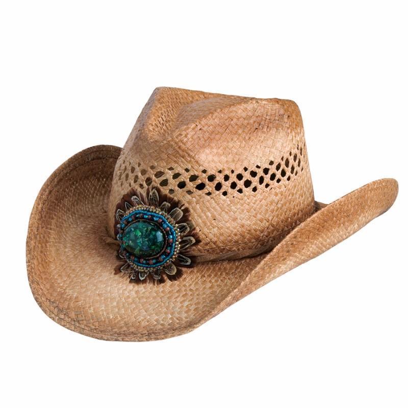 The perfect addition to your cowboy-inspired wardrobe, this Navajo Western Bead and Feather Raffia Hat features a feathered concho western detail that oozes personality and style. Stand out from the crowd with this classic, timeless piece. Has a shapeable brim and a vented crown.