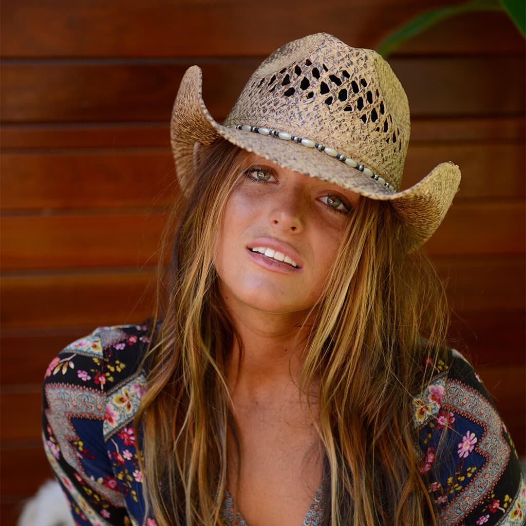 This Pearl Western Raffia Hat is a must-have for any country-style wardrobe. It features a classic western style, a vented crown for breathability and is crafted with high-quality raffia material. Perfect for any outdoor occasion. Has a shapeable brim.