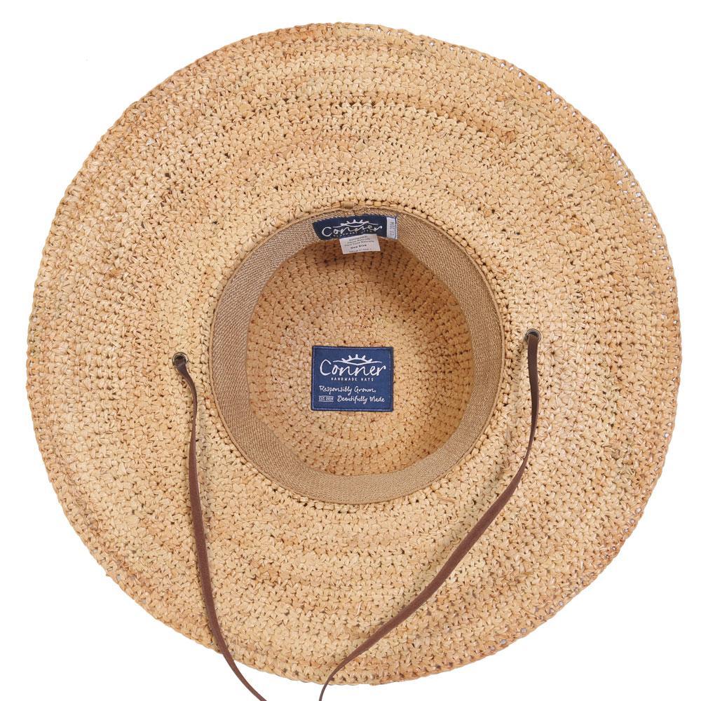 This summer, stay cool and stylish with the Tuscany Wide Brim Ladies Summer Straw Hat. Crafted with hand crocheted raffia, its wide brim offers maximum sun protection with maximum style. Feel confident and beautiful this summer season in this one-of-a-kind hat. A wide brimmed crocheted organic Raffia hat with a leather chin cord is perfect for a good day in the garden or on the boat. Easily packed away for traveling. Fitted with a comfortable stretch inner band for that perfect fit.